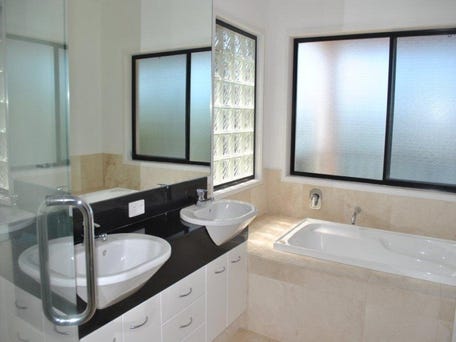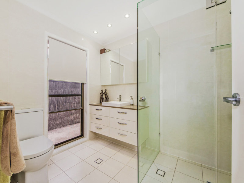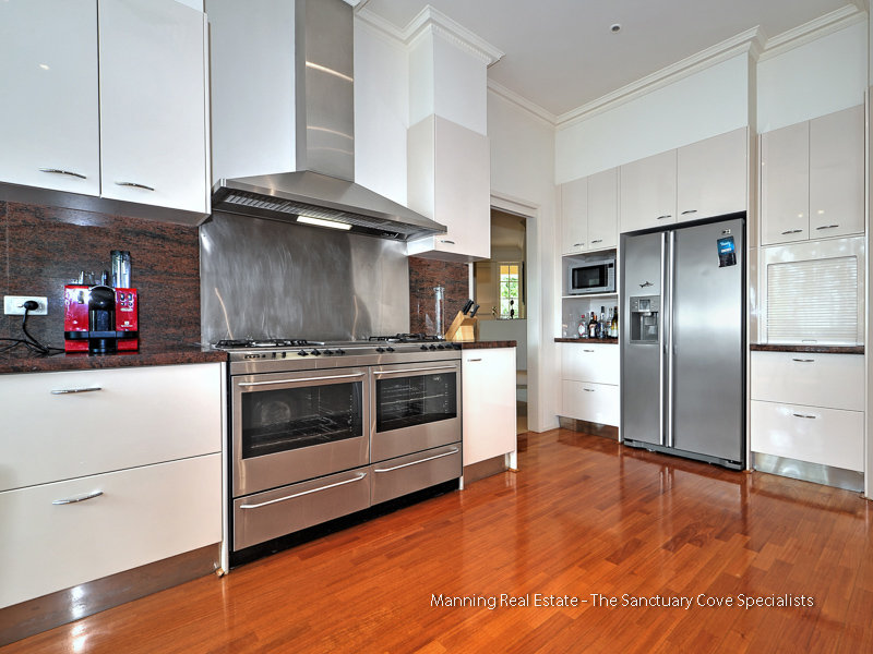 - The modern kitchen is equipped with stainless steel appliances, reconstituted stone bench tops and a marble splashback